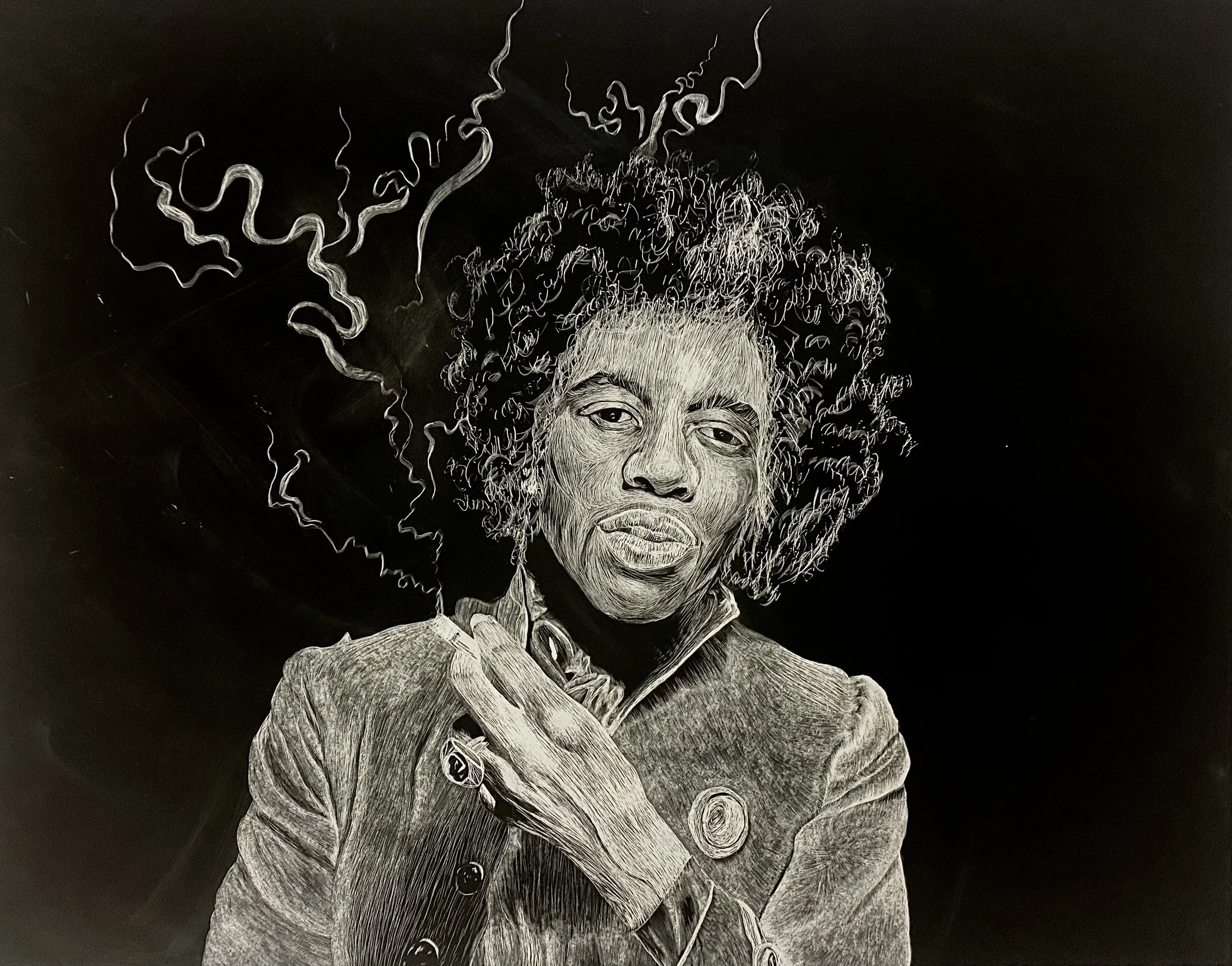 The second scratchboard I have made. I tried to add a lot more detail and fine lines on this one. The first scratchboard I made was of Neil Young a couple years before I made this one.