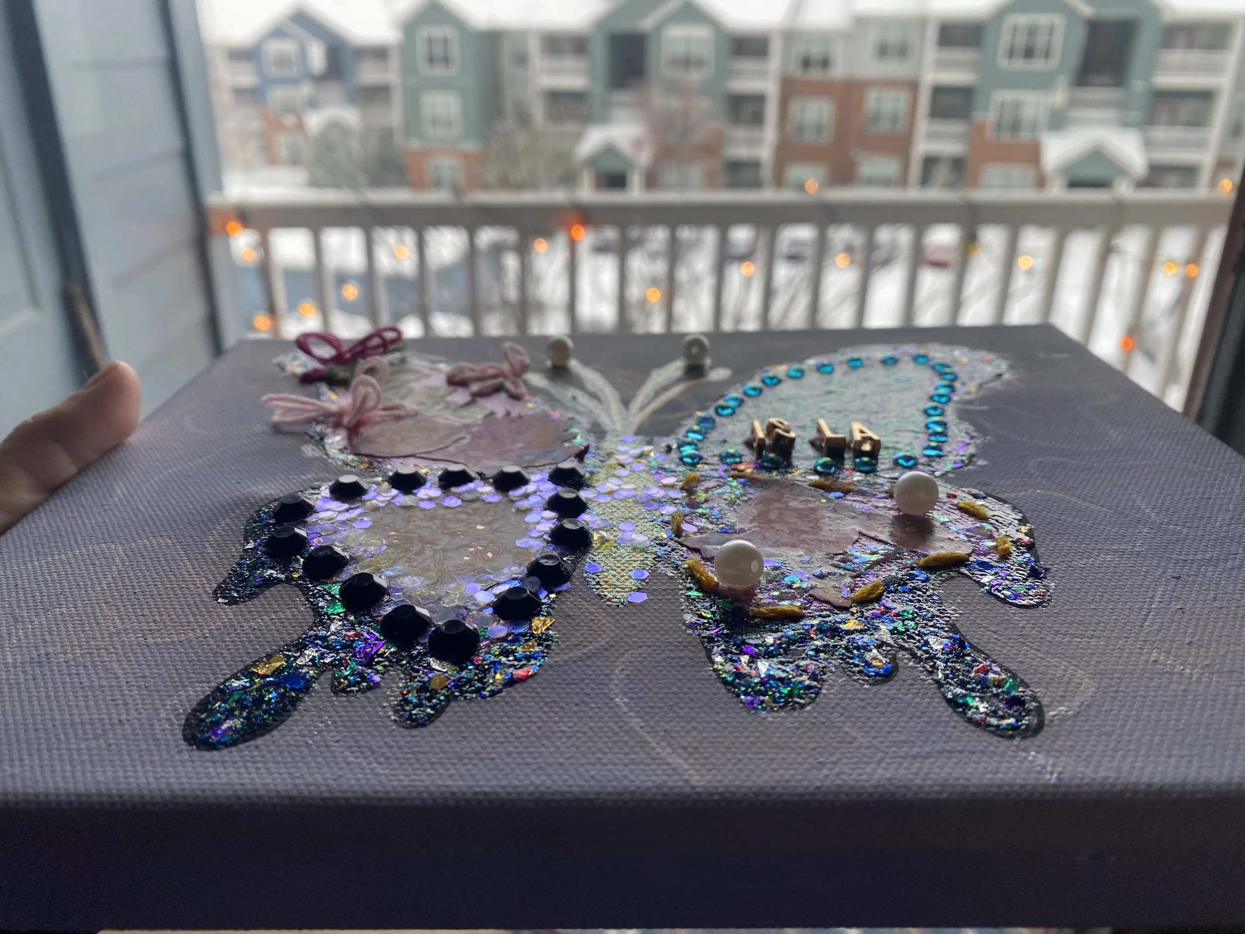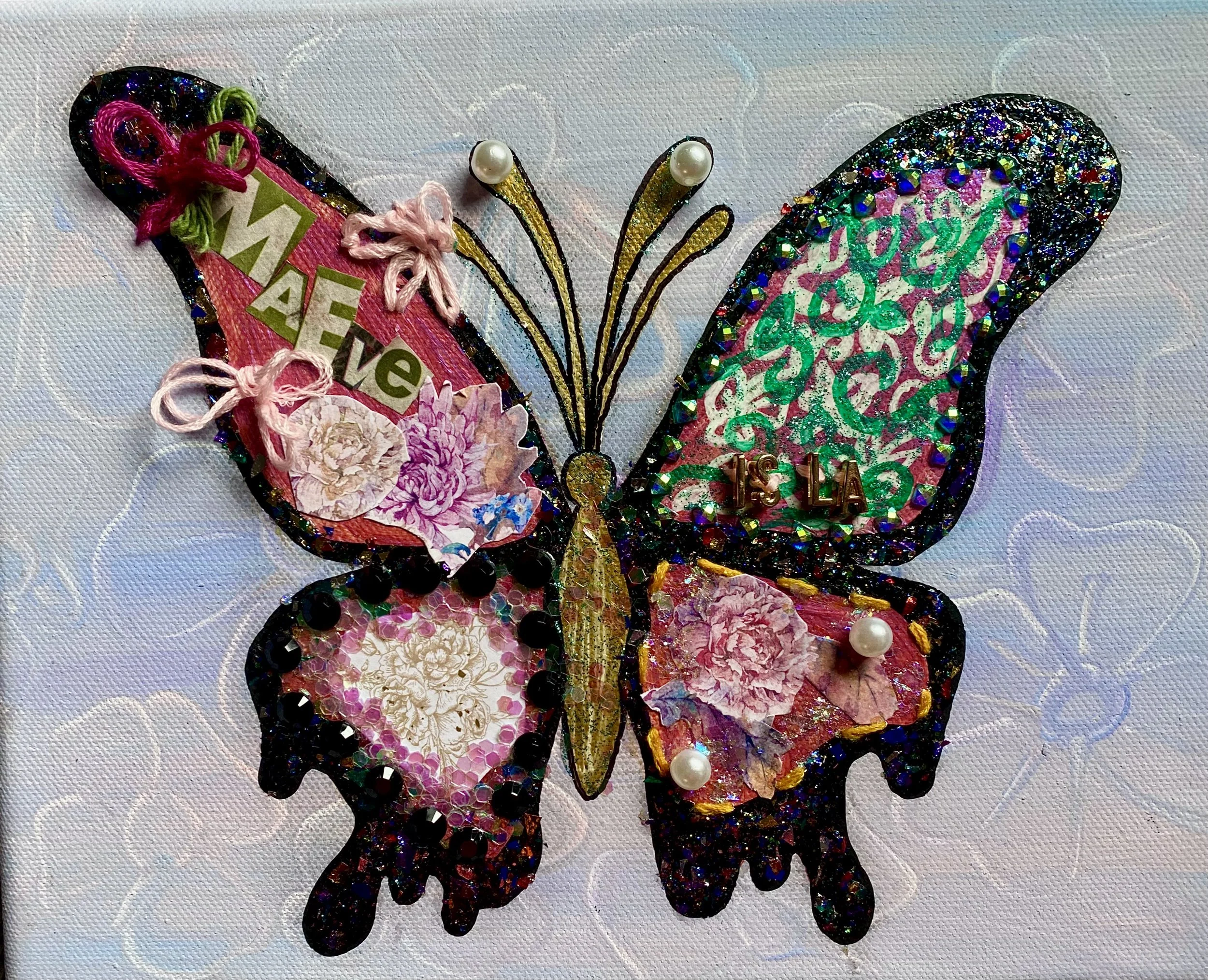 Materials used: Acrylic, canvas, craft beads, rhinestones, collage, embroidery floss, glitter paint, marker, glitter, glue