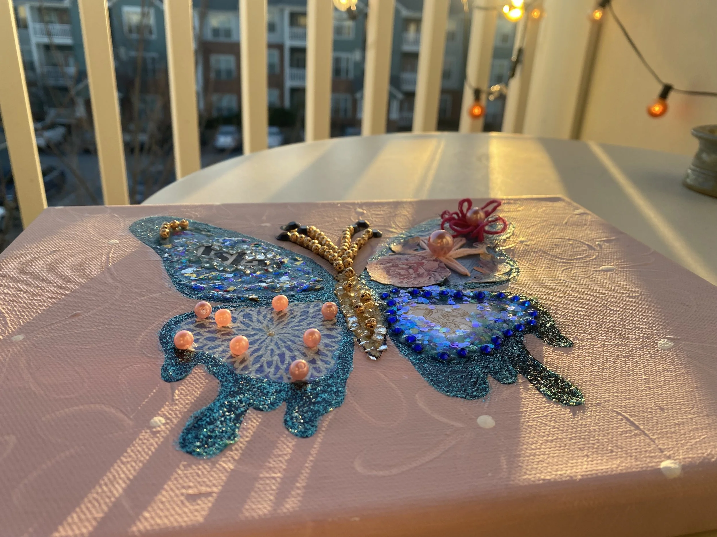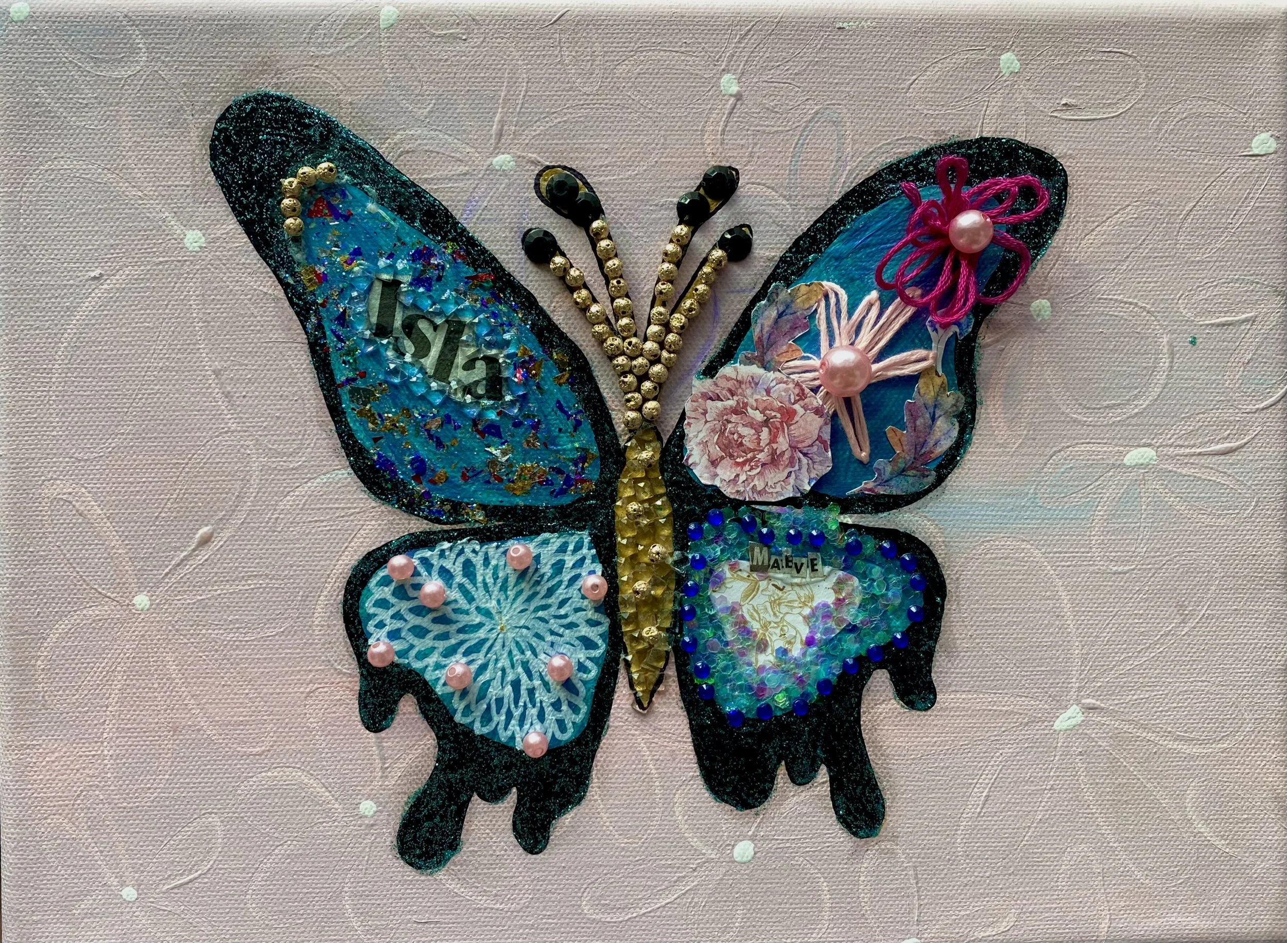 Materials used: Acrylic, canvas, craft beads, rhinestones, collage, embroidery floss, glitter paint, marker, glitter, glue