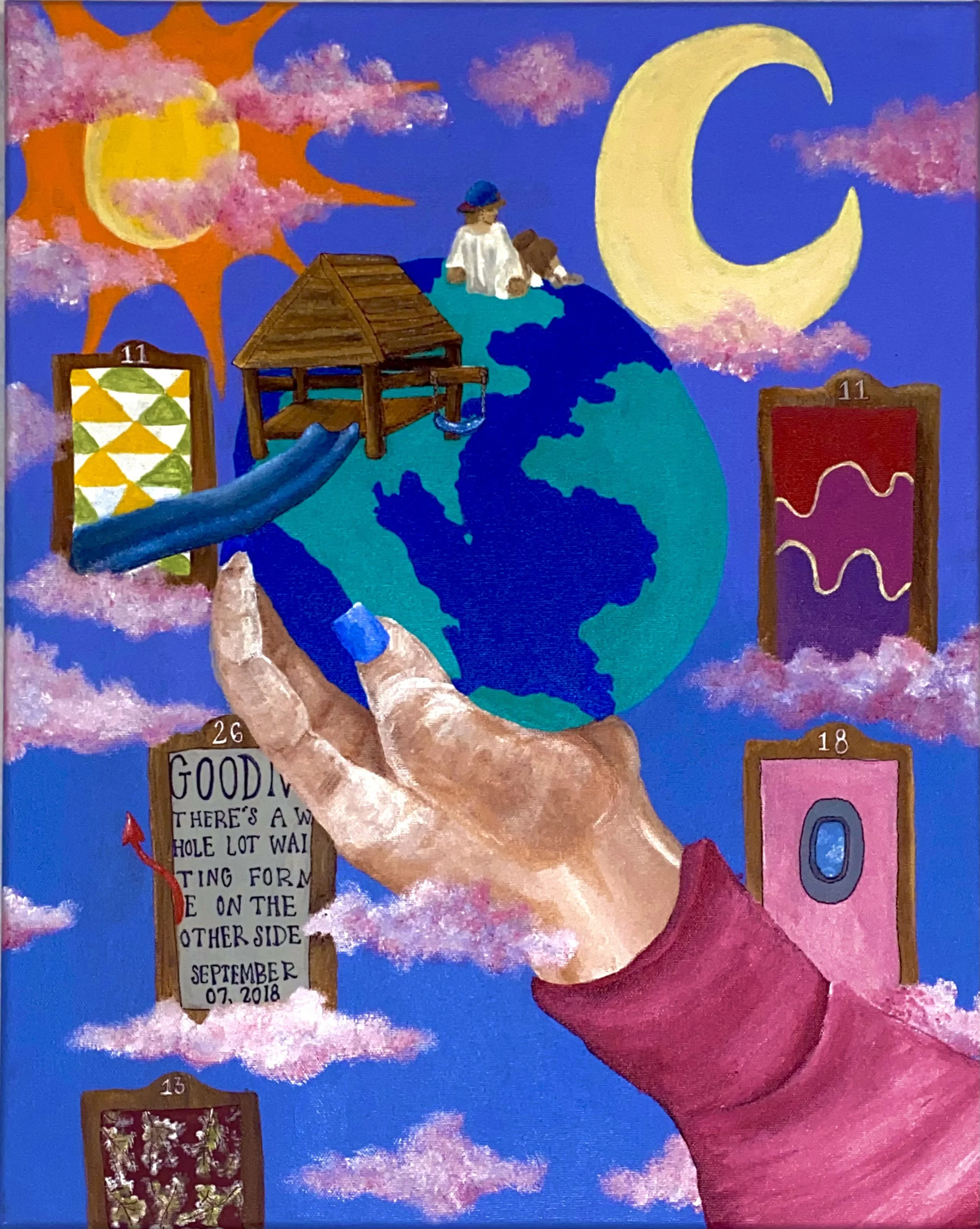 This painting is inspired by- yes, you guessed it- Mac Miller again. I made a list of my favorite lyrics of his, and painted them. For example, “You could have the world in the palm of your hand, you still might drop it.” (So It Goes- Mac Miller)