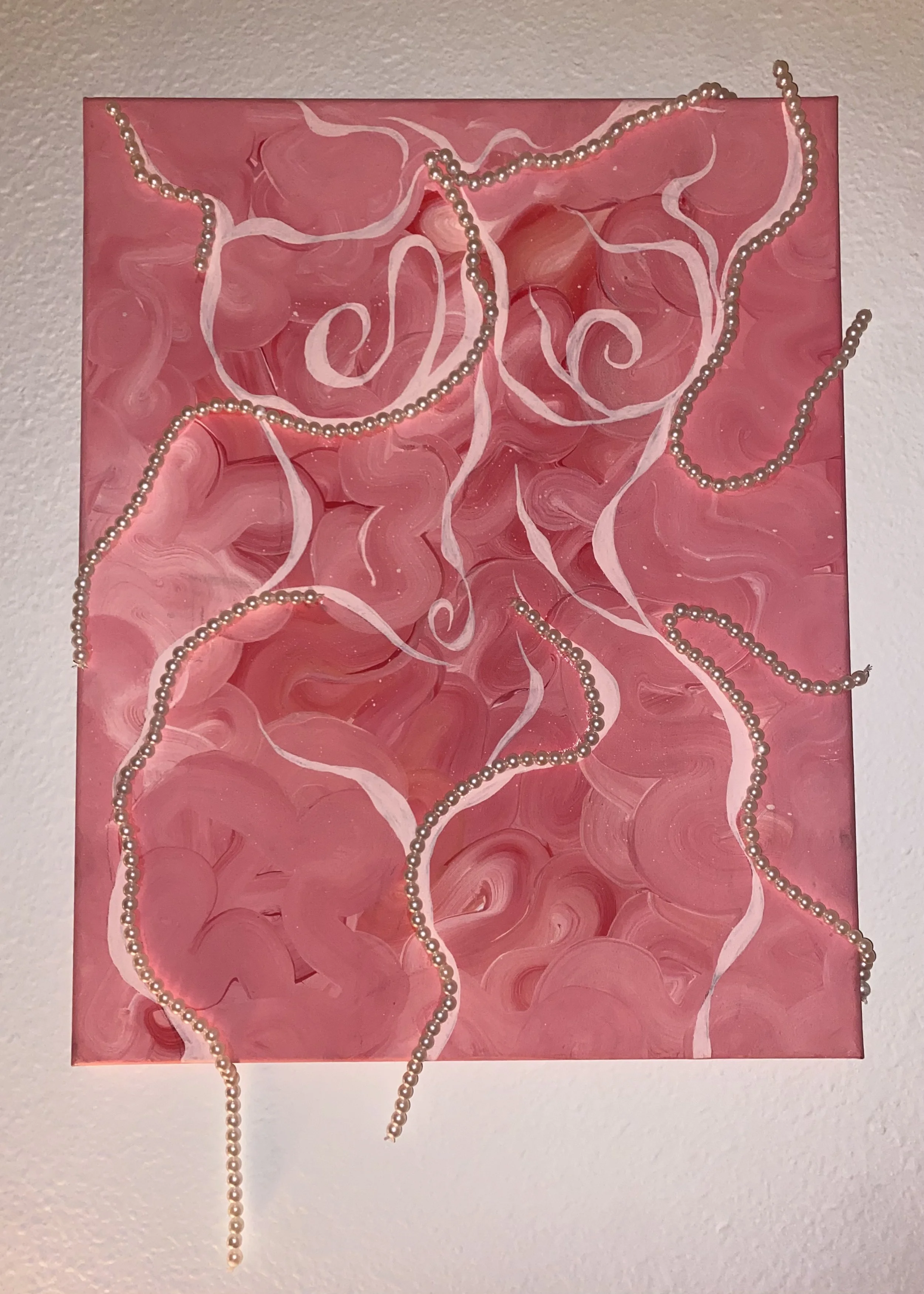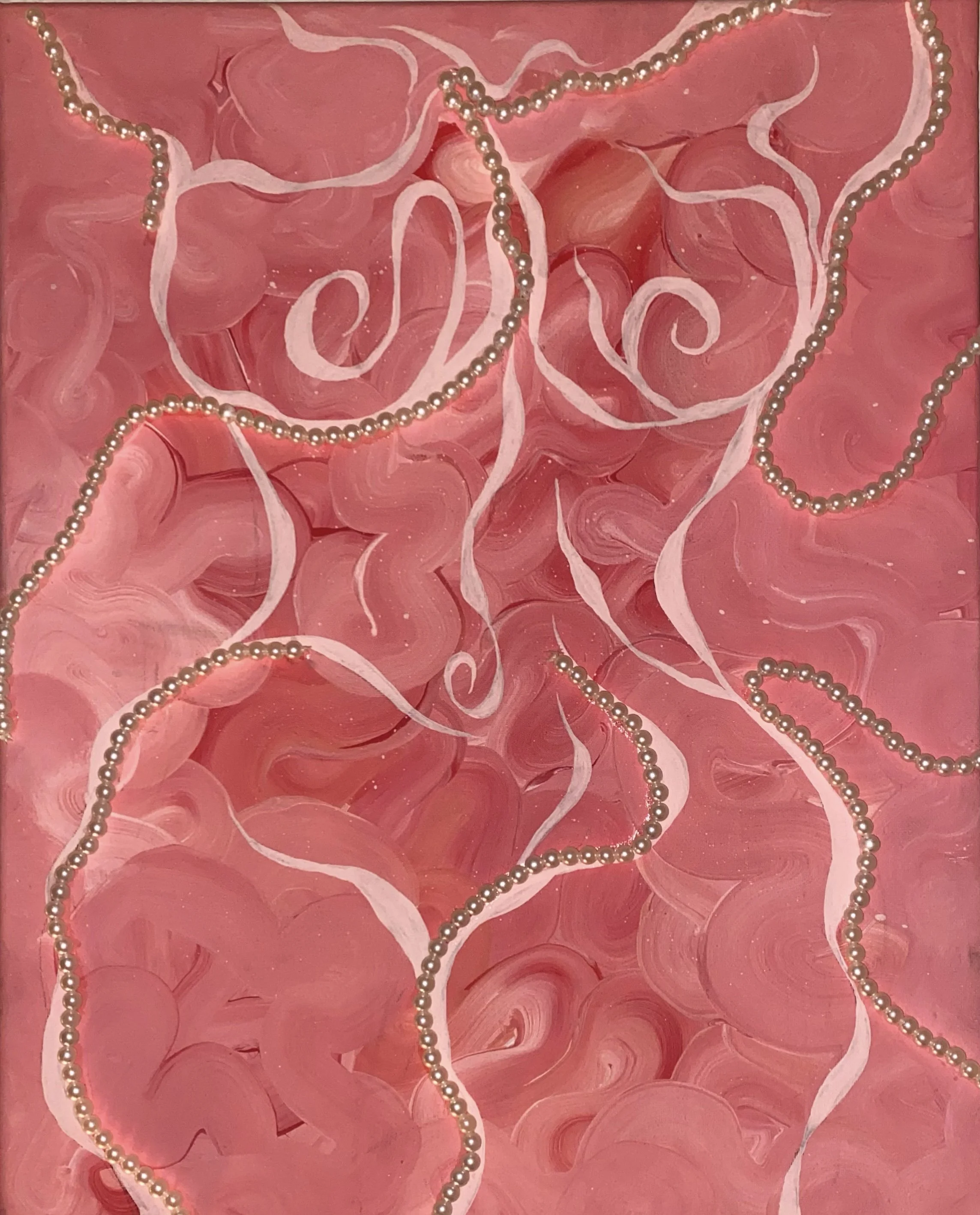 I added the strings of pearls to the bottom of the canvas so that they would dangle for a three-dimensional aspect to this piece.