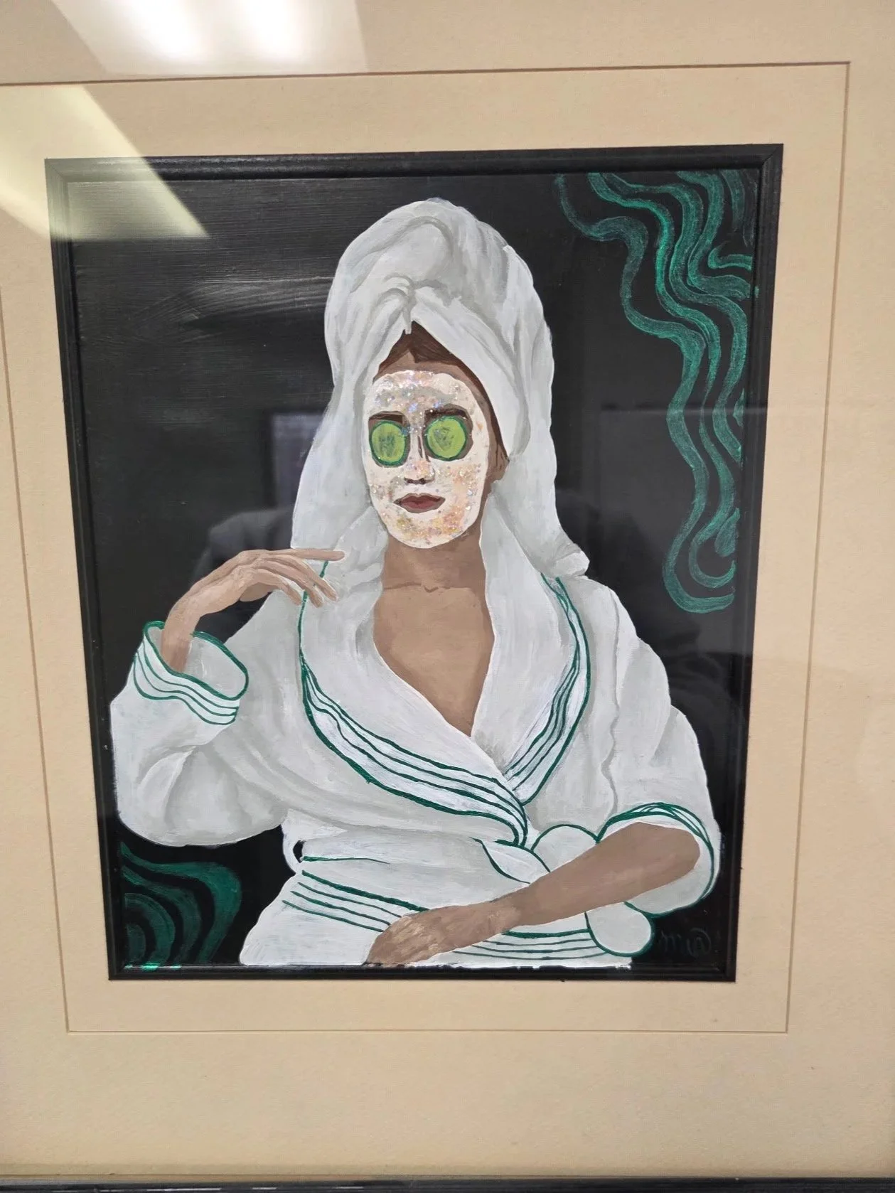 This is one of 2 in this series commissioned by my dad. He owns a towel company that has been in our family for several generations, and his office needed some sprucing up. Diamond Towel sells luxury towels, robes, and other products to mainly salons and spas, and they are made of the softest blends of fabric you will ever feel. I figured there was nothing more fitting to hang in my dad’s office than people in towels.